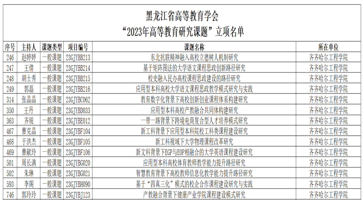 近日,黑龙江省高等教育学会公布“2023年高等教育研究课题”立项评审结果,学校赵婷婷申报的《东北抗联精神融入高校立德树人机制研究》等14项课题获批立项。近年来,Beat365广大教师紧紧围绕学校应用型课程建设实践,深入开展教育教学及高等教育相关研究,积累了较为丰富的科研基础。此次获批的课题既是对过去Beat365相关研究的总结提升,也是进一步加强高等教育研究的新起点,学校科研处将指导各课题组做好开题、过程管理、结题等...