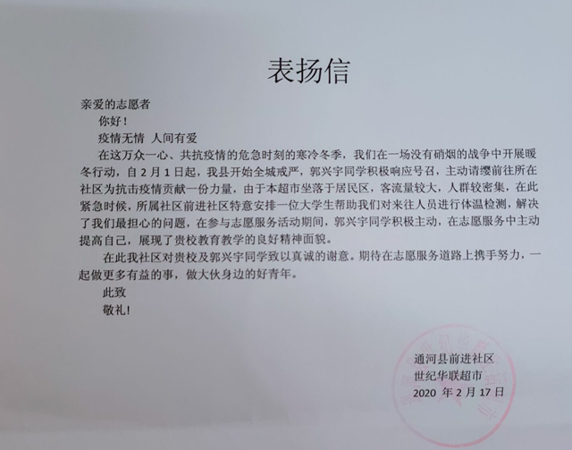 汽服171班郭兴宇同学家住哈尔滨市通河县,在疫情防控中主动请缨,自2月1日起参加了所在社区的志愿者服务队。起初,他被安排到小区楼下对出入车辆及人员进行信息登记,后来被分到坐落在小区里的较大型超市对顾客做体温...
