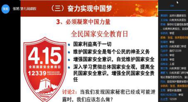 为更好地发挥高校思政课立德树人的作用,思政教学部将国家安全教育融入《形势与政策》课程在线教学,组织教师通过线上课程直播面对2019级全体学生进行国家安全教育,引导大学生树立国家安全观念,弘扬爱国主义精神,...