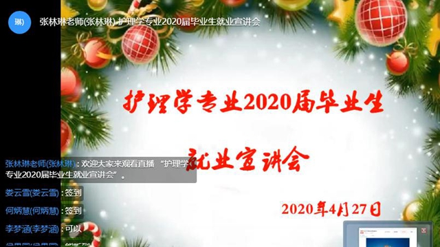 4月27日晚,护理学专业负责人张林琳主持召开2020届毕业生就业宣讲会,为学生推荐可应聘8家医院,包括5家医科大学或医学院的附属医院、3所市级医院。 张林琳为毕业生们讲解了这些医院的招聘条件、招聘流程、考核科目等...