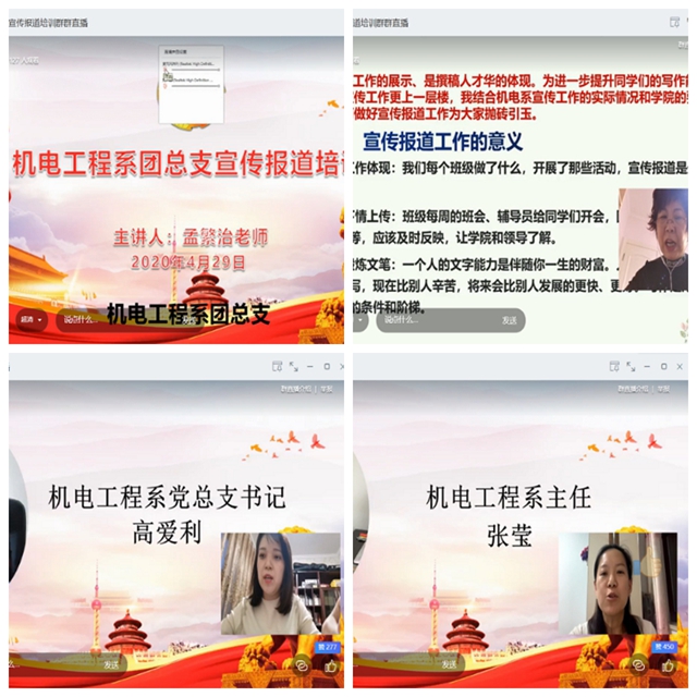 4月29日晚,机电工程系团总支在钉钉平台举办“如何做好宣传报道工作”培训,系主任张莹、党总支书记高爱利、学生工作负责人王虹及辅导员与团学干部等270余人参加。 培训中,系党总支委员孟繁治从“宣传报道工作的意义...