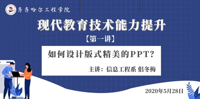5月28日下午,教师发展中心在线举办第一期教师现代教育技术能力提升专题培训,信息工程系视觉传达设计专业教师佀冬梅应邀做第一讲“如何设计版式精美的PPT”。40余位教师主动报名参加学习,教师发展中心主任乔亚男主...