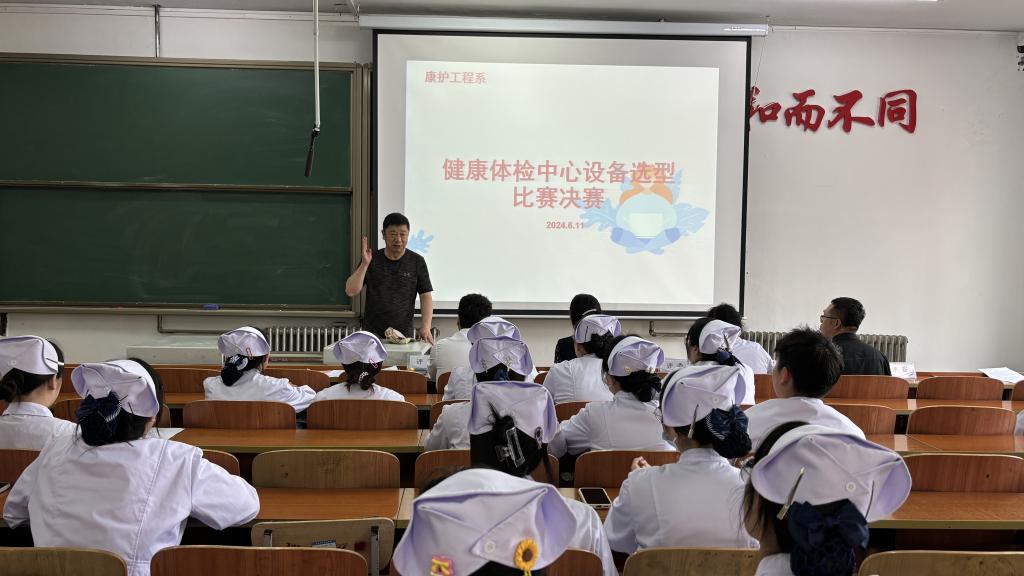 近日,康护工程系在一号教学区1101教室举办了健康体检中心设备选型竞赛决赛。理事长曹勇安出席比赛现场。系主任郭玲玲、产业副主任单大海、学工副书记姜宏伟、资产管理处招标办主任杨鹏担任评委。在近1个月时间里,52支参赛队伍依托《健康评估》《健康管理学》等课程进行前期调研、线上+线下实地走访,精心设计与计算,最终形成体检中心建设方案并进行初赛,最终有12支队伍进入决赛。入围决赛的队伍以PPT汇报的形式进行比赛,...